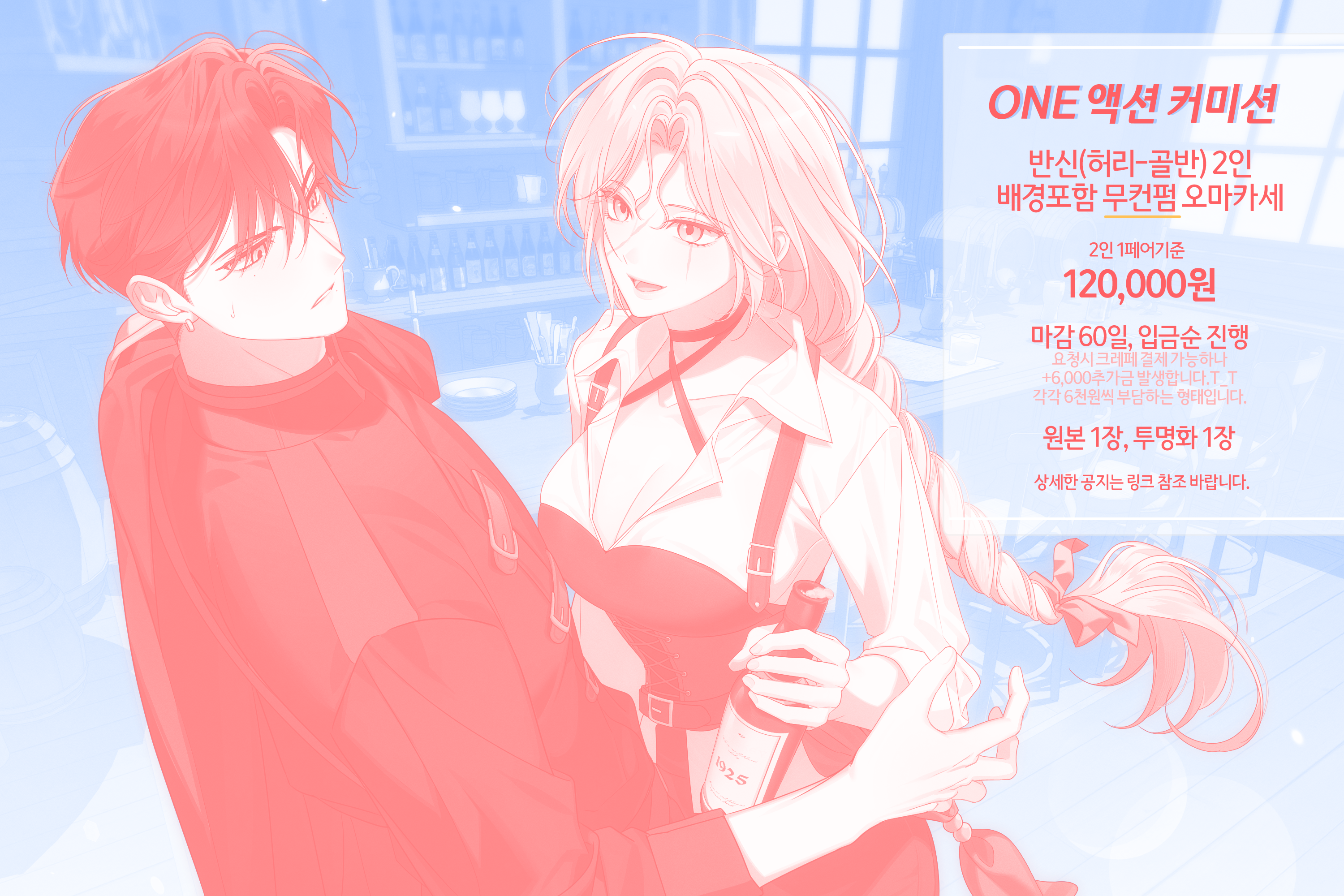 》검거나 어두운 옷이 있는 쪽이 퀄리티있게 나옵니다. 백색이 많을 경우 배경이 어두운 연출을 권장드립니다.추가금 안내사항 》 꾸밈이 많은 복잡한 복장(ex.로판 드레스,제복) (1인당) +10,000